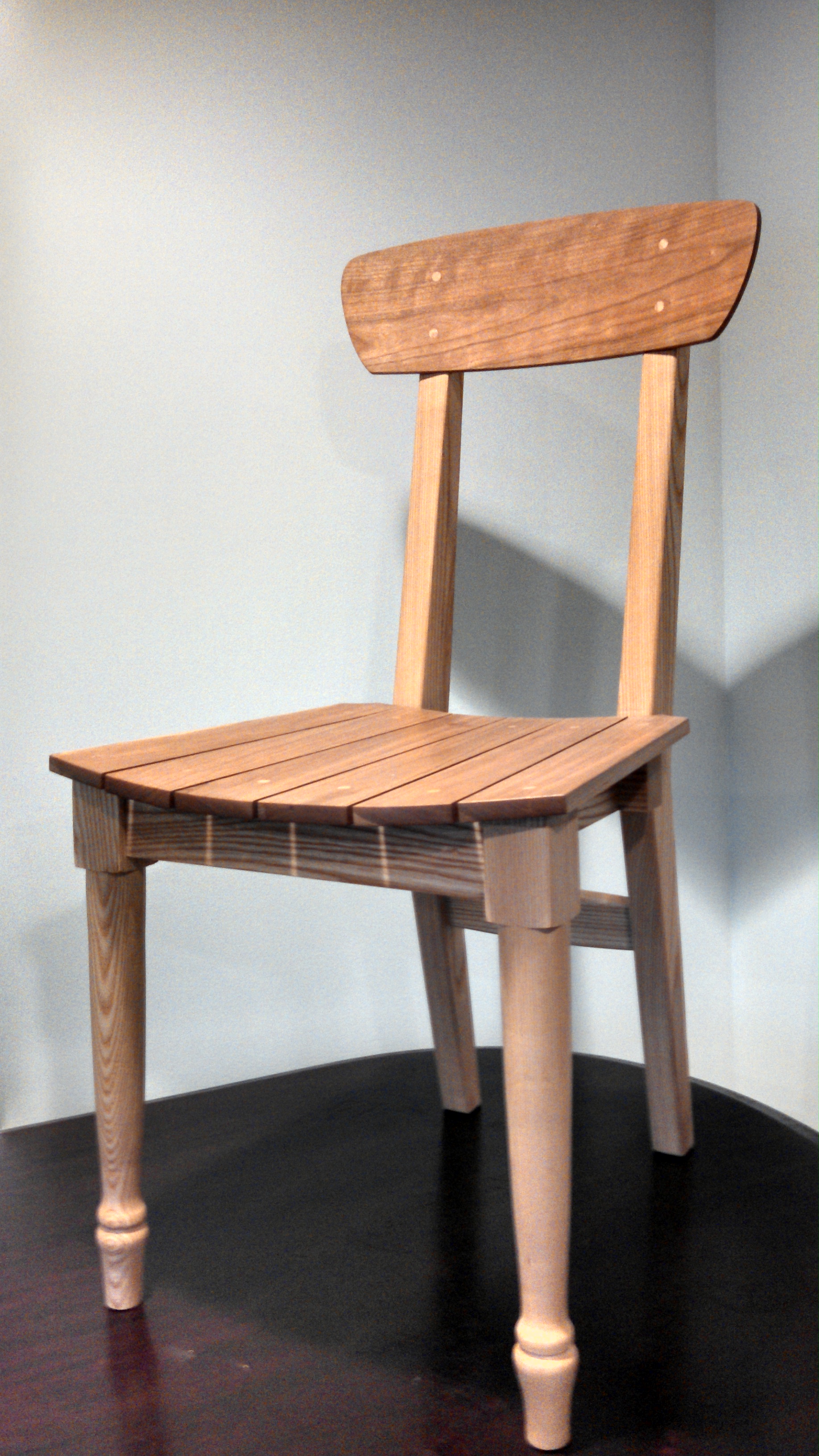 Chair made of Ash with curved Cherry Seat and back.