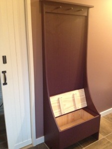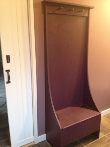 Hall Tree Bench made of white pine and tung and groove southern yellow pine back. Dimensions are 15 inches deep, 27inches wide and 72 inches high.