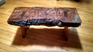 Live Edge Redwood Bench with Black Walnut legs splayed 5 degrees with through tenons. This bench has 6 coats of handrubbed varnish, wetsanding between each coat.
